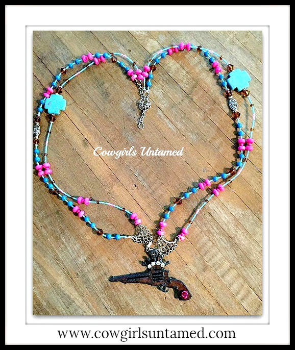 Rustic Brown Metal Crown N Pistol Pendant on Aqua N Hot Pink Seed Bead N Turquoise with Amber Crystal N Large Turquoise Cross Double Strand Beaded Long Western Necklace