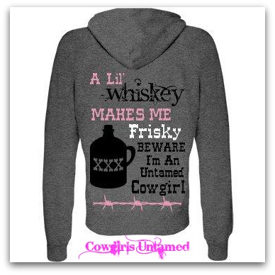 LOTS OF HAPPY CUSTOMERS!! Matches our t-shirt! Printed on back only, this quality zip up hoodie has "A Lil' Whiskey Makes Me Frisky I'm An Untamed Cowgirl" on the back with 2 graphics: XXX Liquor Jug and barbed Wire. 2 pockets in the front and drawstring hoodie. Made of soft cotton fleece. All pink and black script and graphics on the black hoodie change to red and silver.