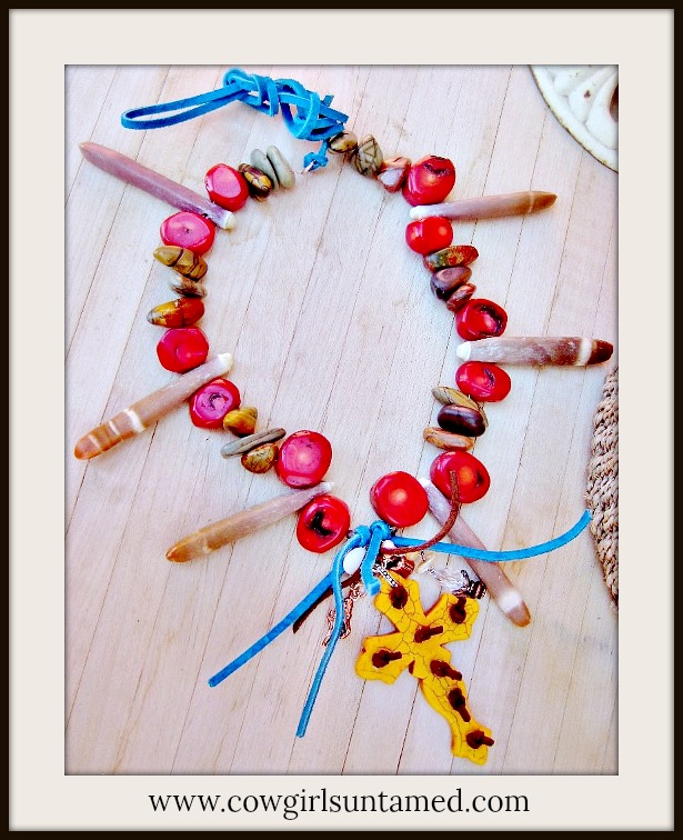 This necklace has gemstones and leather: Teal and Brown Suede, Genuine Red Coral, Delicate Sea Urchin Spikes, Shells, and Jasper.
