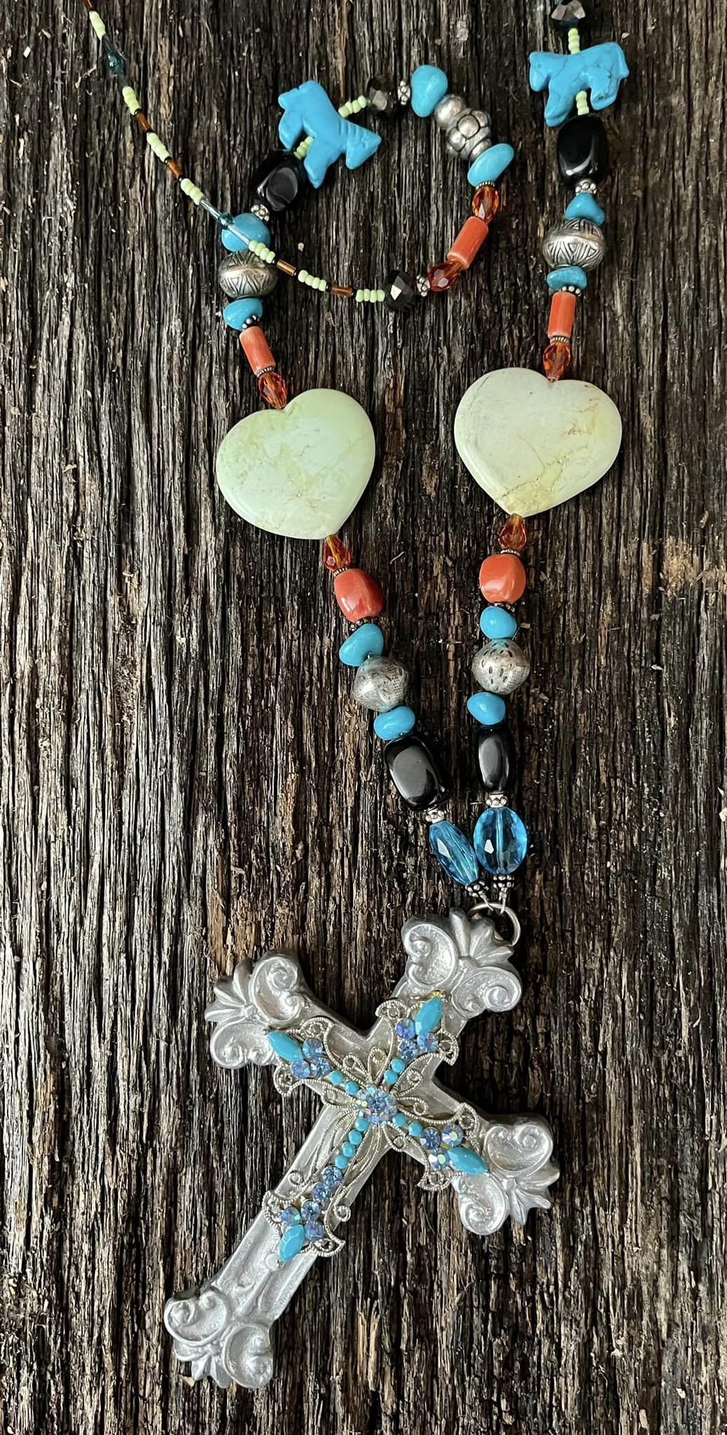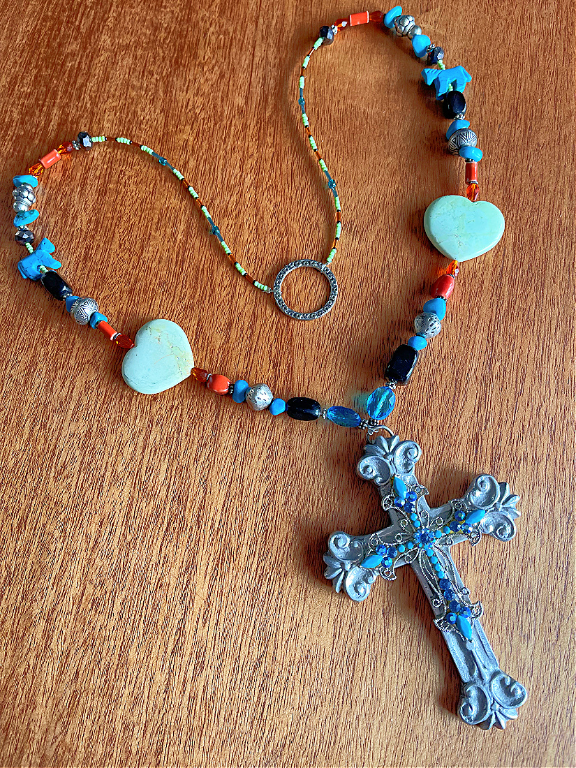 Large Blue Crystal Layered Pewter Cross on Green Turquoise Heart Blue Turquoise Horse Indian Fetish Black Hematite Orange Swarovski Crystal Beaded Long Necklace