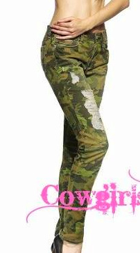 These casual sexy fit skinny jeans are super cute with their camo design in shades of green and loads of stretch! Skinny low rise fit. Looks great with a tunic and boots! 5 pocket design. Zip front. 98% Cotton 2%Spandex.
