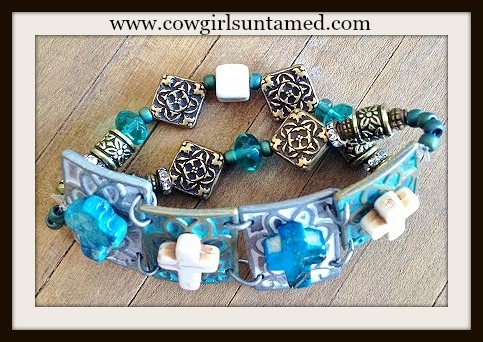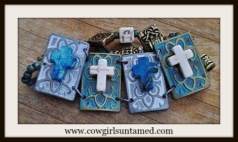 4 beautifully etched white and aqua patina metal panels are adorned with jasper gemstone and white howlite turquoise crosses. The back is double beaded with teal crystals, teal raku beads, and white howlite turquoise.