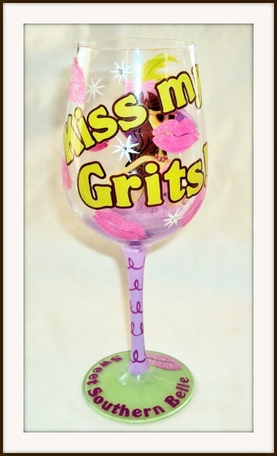 Hand Painted "Kiss My Grits" & Glitter Lips Western Wine Glass