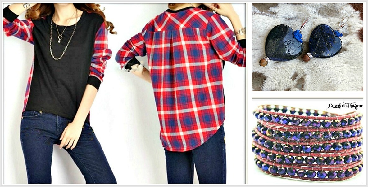 Blue and Red Plaid N Black Long Sleeve Hi Lo Hemline Western T- Shirt Top