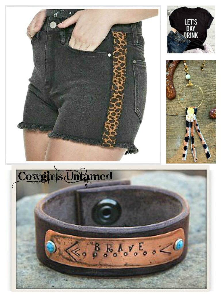 BRAVE: This cuff features a completely, hand-stamped arrow design and stamped wording that reads, "BRAVE". The stamped copper plate is attached to the 1'' wide brown leather cuff with two synthetic turquoise rivets. Total cuff length is 8.5'' and a snap closure is set at 7.5'' to fit an average wrist size.