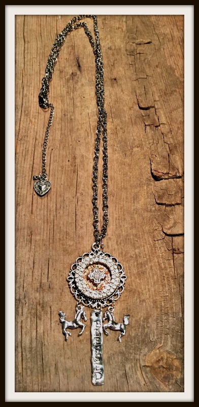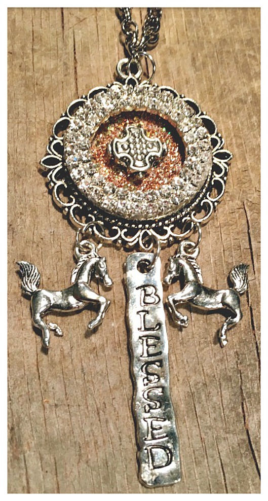 Beautiful long necklace in antique silver and gold. GREAT GIFT!! This custom pendant is one of a kind. Beneath its cross is sparkling gold, and it is surrounded by a piece of antique rhinestone jewelry. It rests in a small antique silver round cameo. Beneath it are 3 charms: antique silver horse; "BLESSED" bar. At the end of the linked chain is a heart charm.