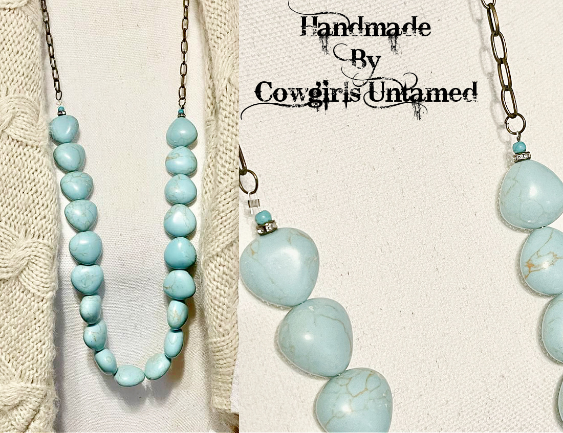 Vintage insprired, this turquoise and antique bronze necklace will be a "go to" necklace for y'all. Looks great with a white tee or blouse and jeans or shorts. Perfect for daily wear. Over 20 beads were used along with the antique bronze chain. A turquoise beaded antique bronze fairy sits on the back. This is a pullover style ~ no closure. 33" long.