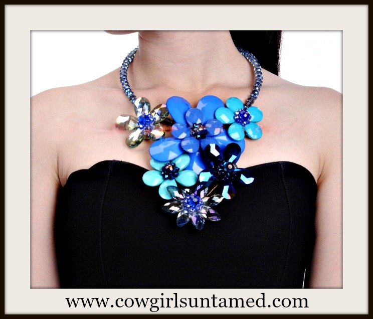 Beautiful shades of blue flowers on this bib necklace!  Looks great when worn with anything v-neck or deep v-neck. Weighs 195grams. Crystals wrap around the neck. Adjustable length. Acrylic.