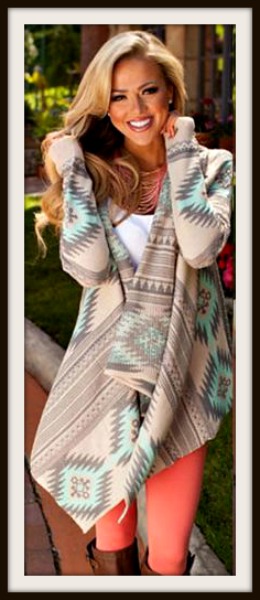 Mint Green Gray Allover Tribal Knit Long Sleeve Asymmetric Hemline Western Cardigan