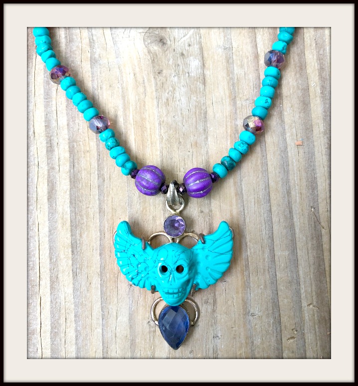 Deep Teal Turquoise & Amethyst Winged Skull 925 Sterling Silver Gemstone Pendant on Gemstone Beaded Necklace