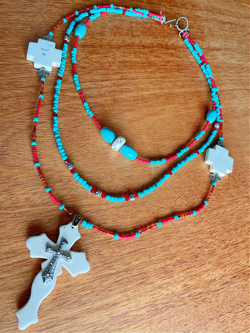 Triple Strand Turquoise Red Crystals Ivory Crosses & Red Indian Beaded Large Cross Necklace