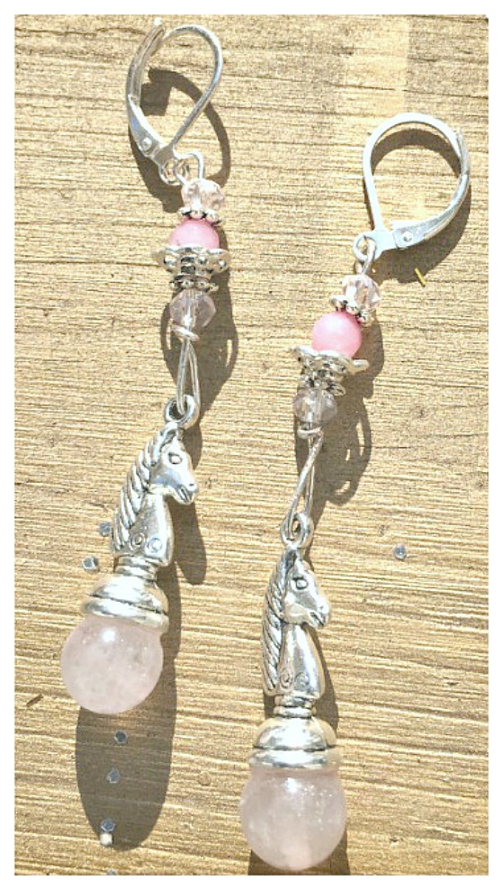 Pretty in pink, these equestrian gemstone earrings are perfect for those who love pink! Great gift! Silver tone. Handmade USA. Handmade Horse & Jade Charms.