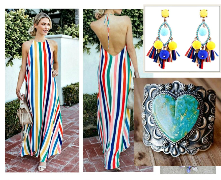 Multi Color Stripe Sleeveless High Neckline Halter Style Boho Maxi Dress