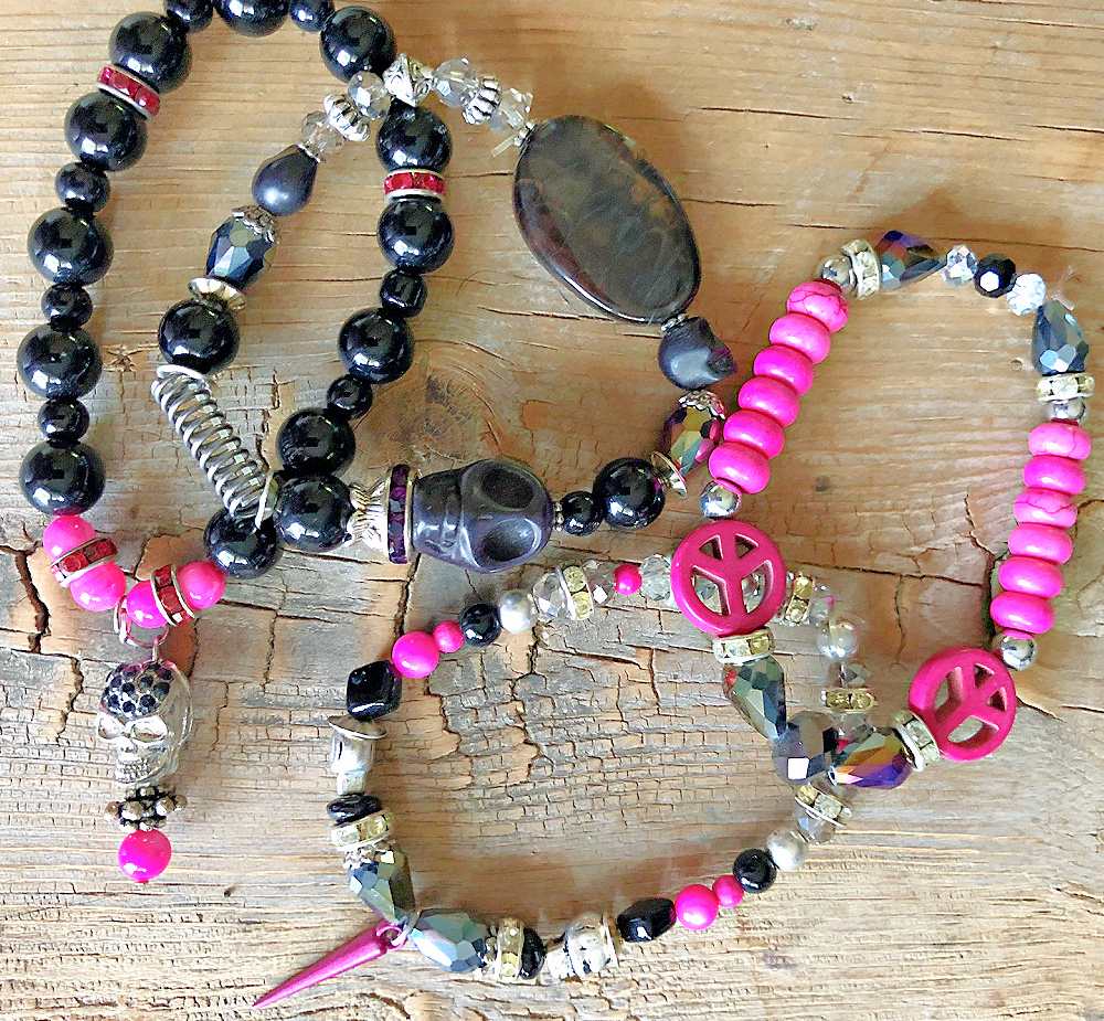 If you're into skulls these handmade stretch bracelet sets are for you!  Rhinestone skulls, gemstones, and glass beads used. One of a kind. Handmade. 4 bracelets.