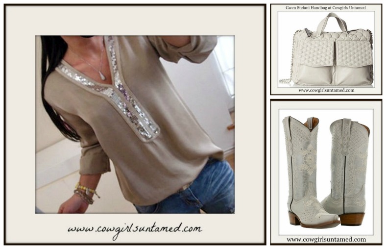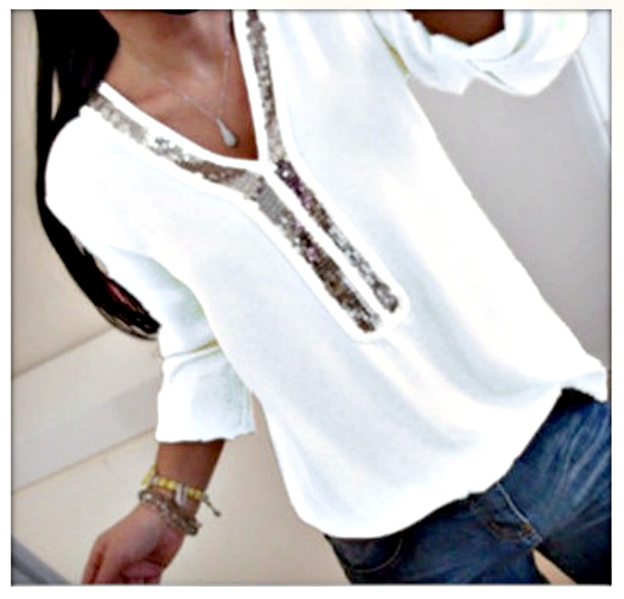 Silver Sequin V Neck Long Sleeve Beige Blouse