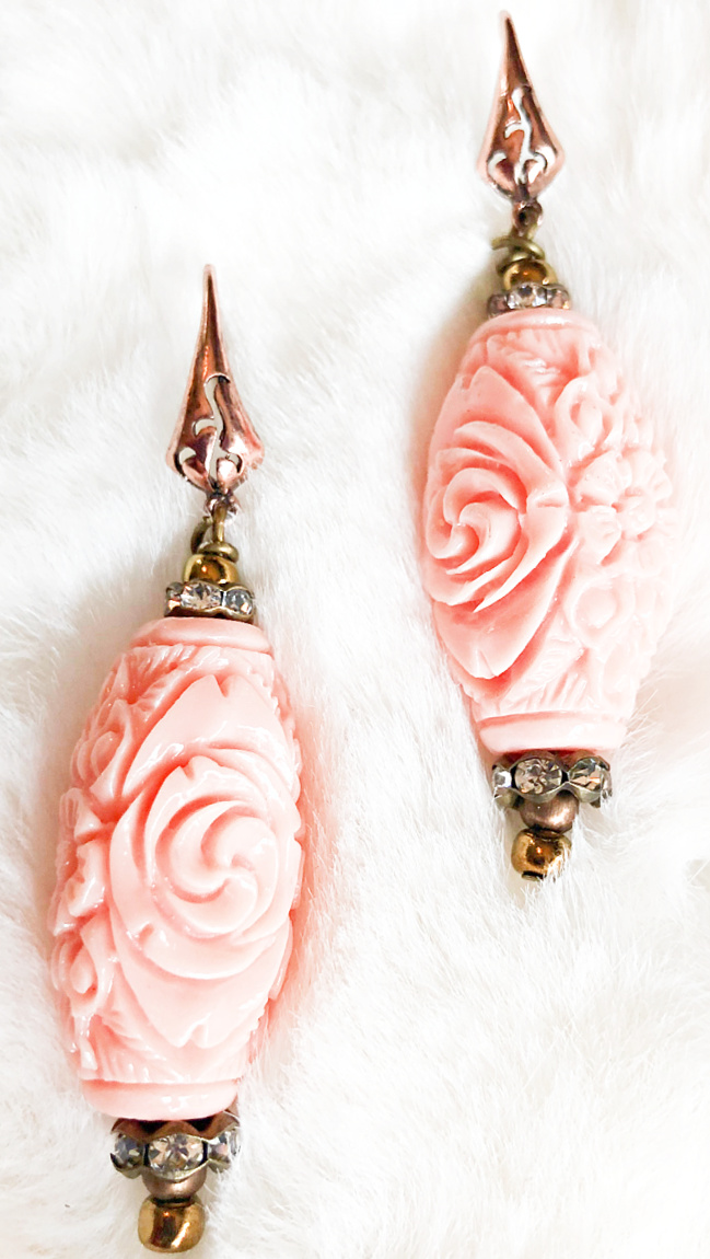 Floral Hand Carved Pastel Shell Rhinestone Copper Handmade Earrings