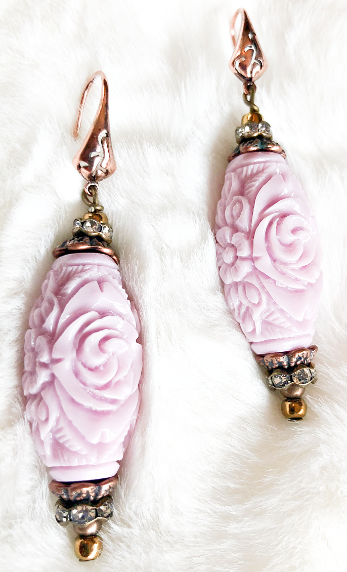 Pastel colors of lavender and peach combined with copper to create a beautiful color combination! The center piece is a hand carved tridacna shell!  They are flanked by rhinestones. Lightweight. Great gift!