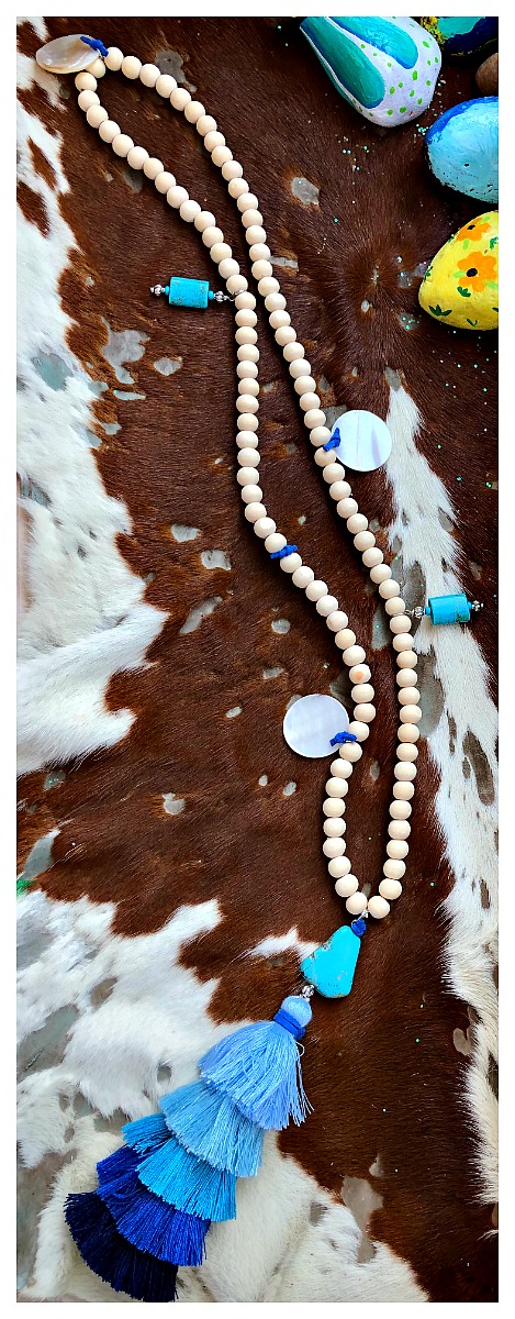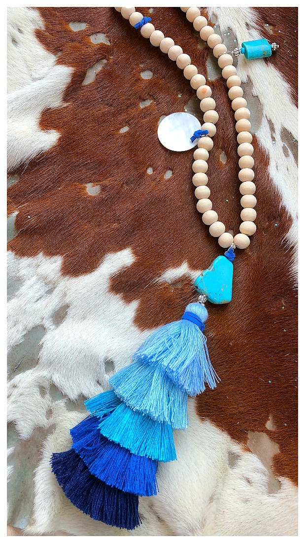 Handmade and beautiful, this long boho necklace is on trend and a must have! We love the tiers of colors on the silk tassel!! Linen tassel 6" long pendant with genuine leather wrapped top and mother of pearl shell charm, and coordinating turquoise bead charms along the necklace. 34" long necklace plus the tassel pendant. Gorgeous and one of a kind! Linen tassel thread. Wood beads on the necklace. Genuine shell.