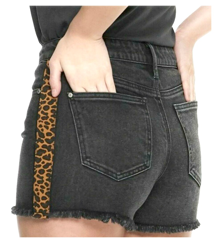 Leopard Side Stripe Mid Rise Black Cutoff Jean Shorts