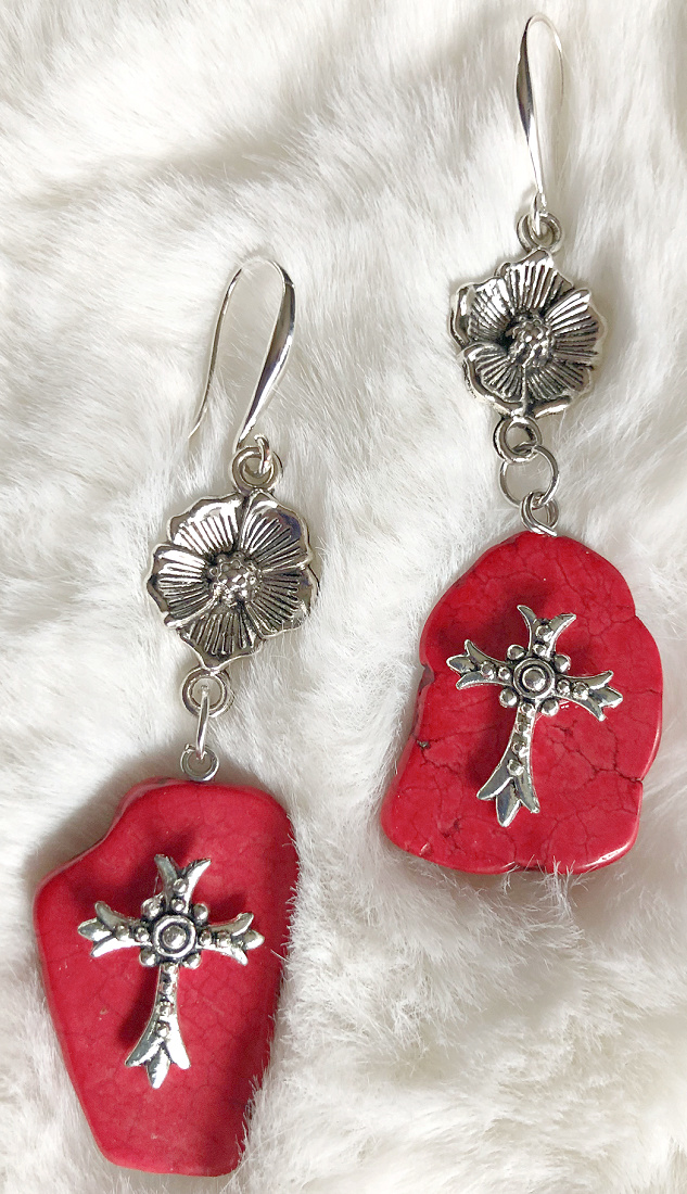 Our beautiful long BLESS ME earrings are handmade here at COWGIRLS UNTAMED! Silver floral extenders with embellished red turquoise! Great gift! Dress them up or down. Check our our handmade necklaces and bracelets for a complete look!