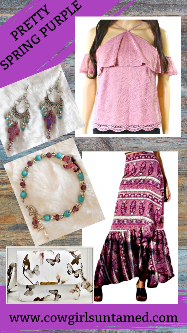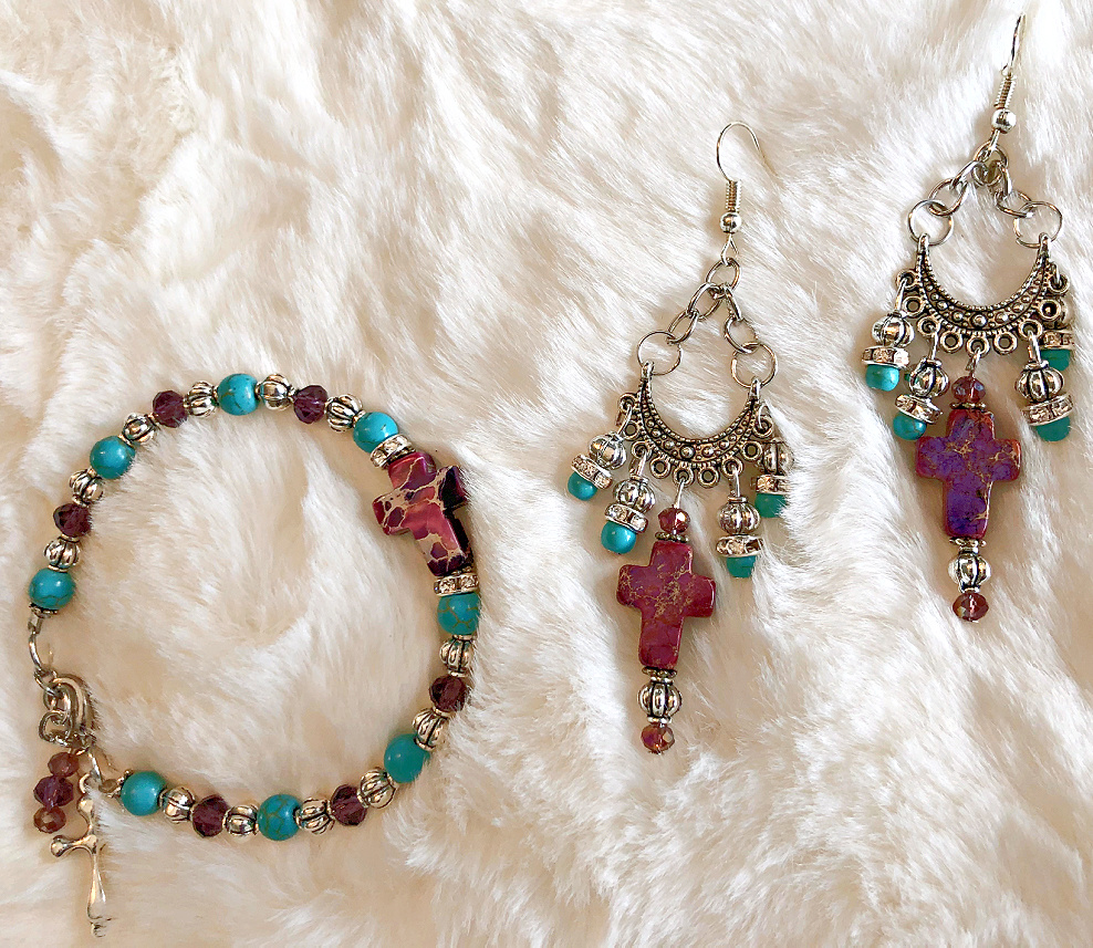 Artisan made here at Cowgirls Untamed,  hand beaded with quality in mind, into a beautiful color combination of purples and turquoise . The center charm is a purple sediment jasper cross flanked by rhinestones. Crystals. Turquoise. Adjustable. Double charms on the extender - silver cross and custom crystal charms.