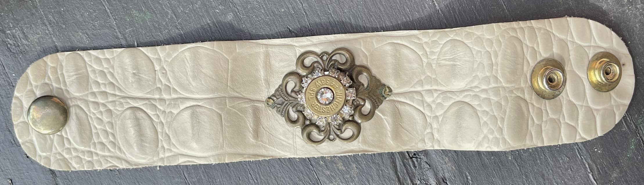 Our Winchester 44 Bracelet is handmade, and one of a kind! Double snaps make it adjustable. Genuine embossed leather. Beautiful rhinestones and crystal center bullet. Bronze accents. Great gift!