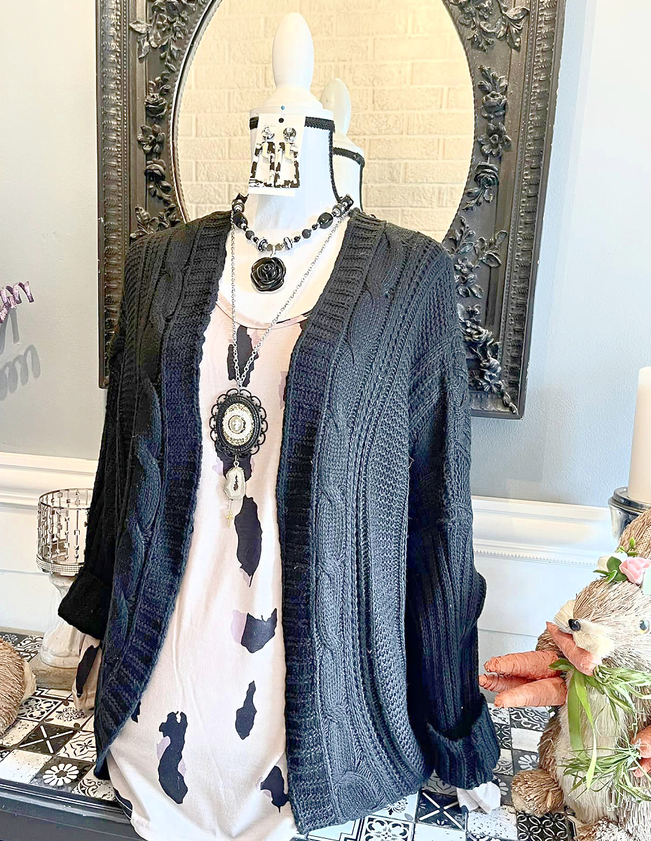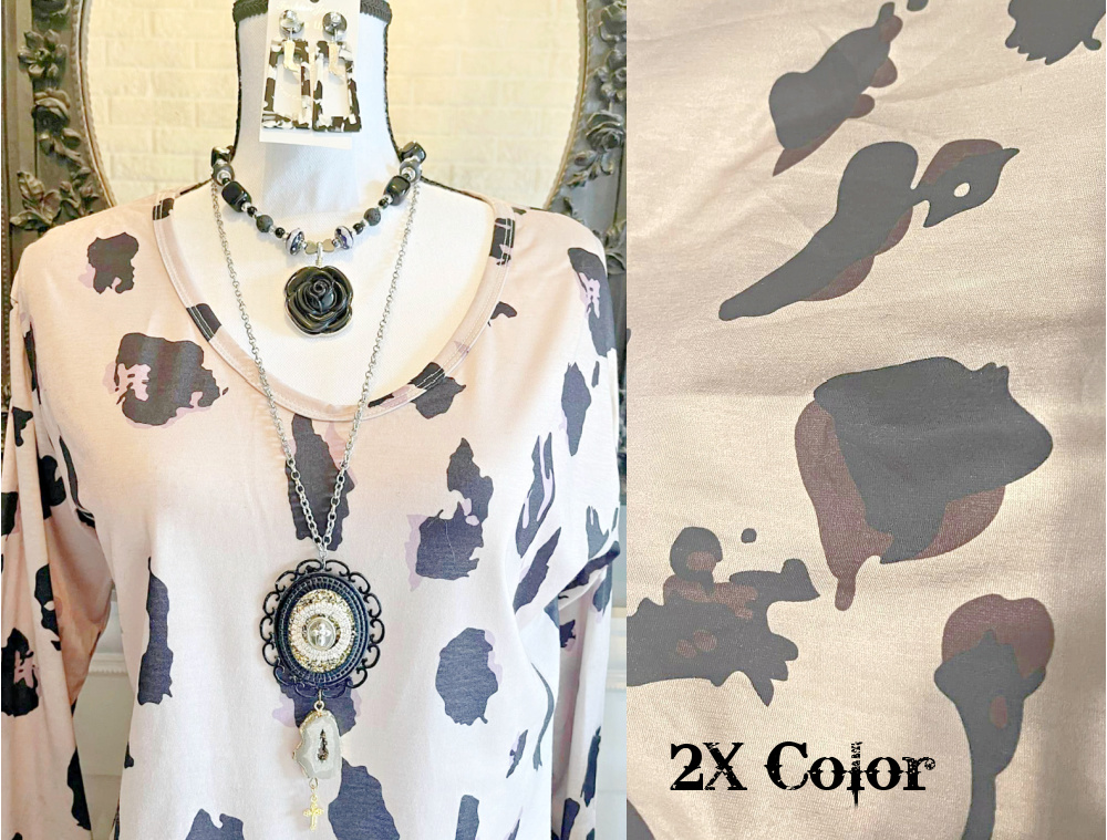 This long sleeve top is perfect to add a little WILD to your outfit! We love the large patterned black leopard spots. S-XL has a little lavender along the black spots, and the 2X has brown along the black spots. Flattering scoop neck. Cotton blend fabric. Runs large, and has stretch. Great casual top for when you need a little somethig extra!