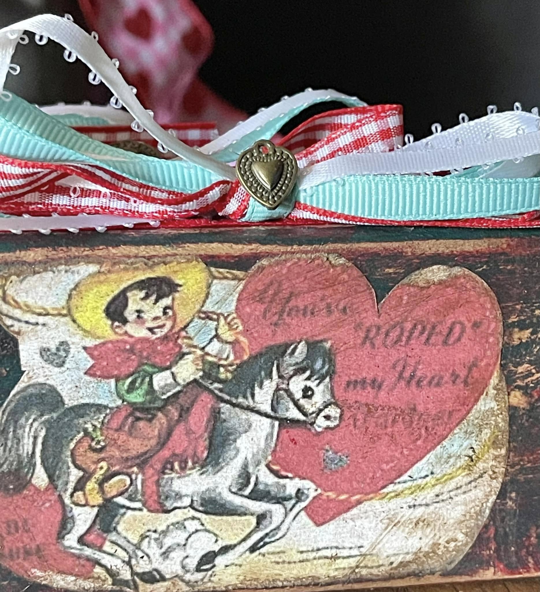 This handmade vintage style shelf sitter has a retro cowboy riding his spotted horse. His red valentine says "You've Roped My Heart". So cute, and what a great little gift to give your loved one. On the top sits an aqua, red check and white bow with an antique bronze heart at its center.  Sides are wrapped in red velvet.  It's painted a red & turquoise color in a rustic distressed style, then stained. Perfect for a gift or a sweet addition to your Valetines decor.