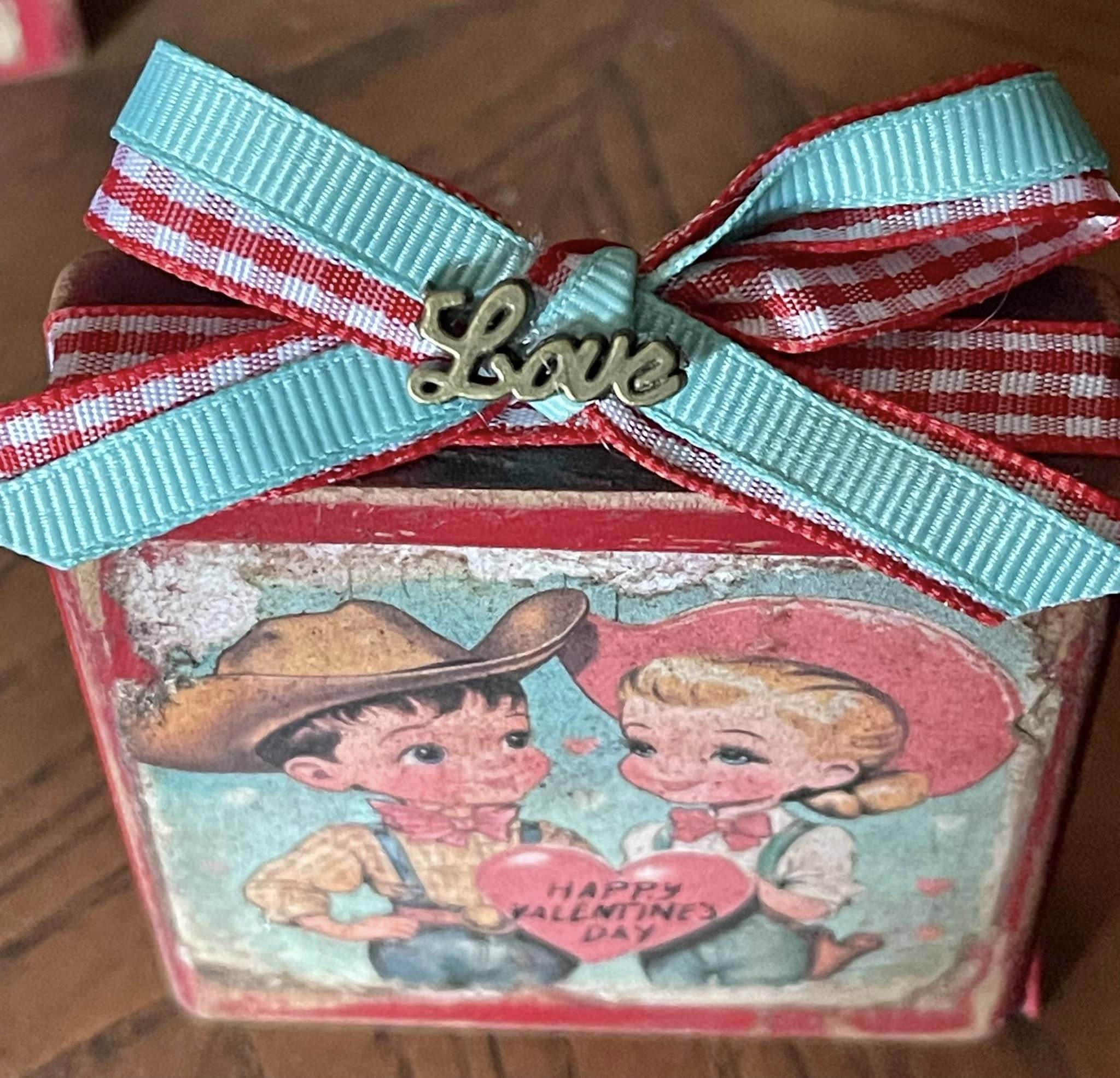 Handmade Retro Cowboy Cowgirl Valentine on Red Rustic Distressed Wood Block with Bow & Boot or Love Charm Shelf Sitter Tiered Tray Western Decor