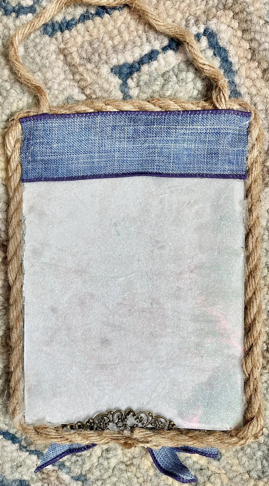 This darling vintage Valentine has been reprinted and enclosed in glass, filigree brackets added, surrounded with rope, and a denim bow added at the bottom. Hanger is also rope. Delicate, but can be hung. Makes a wonderful valentine gift!