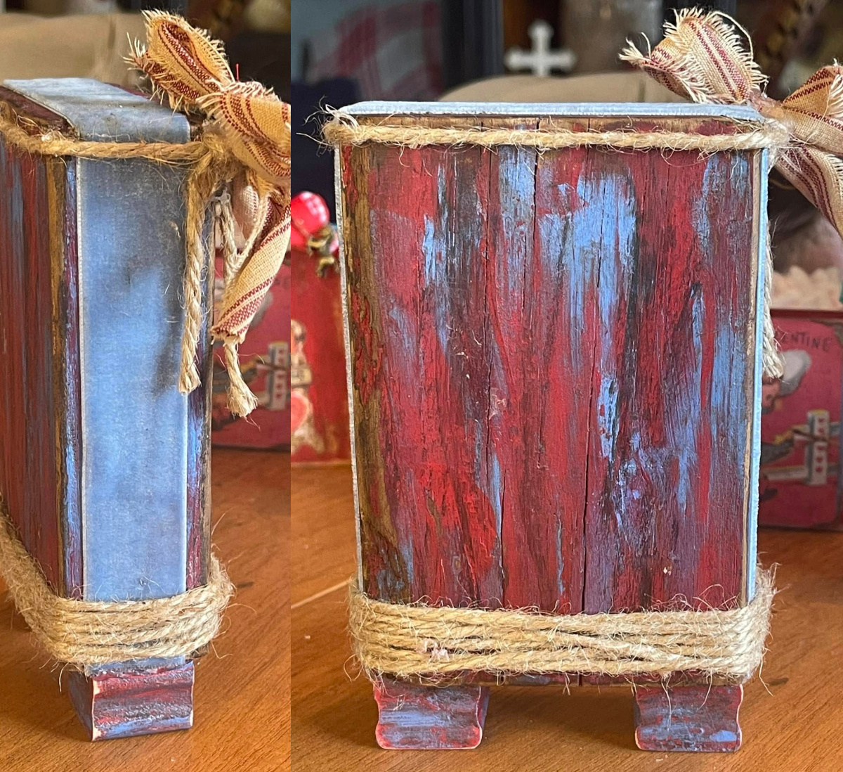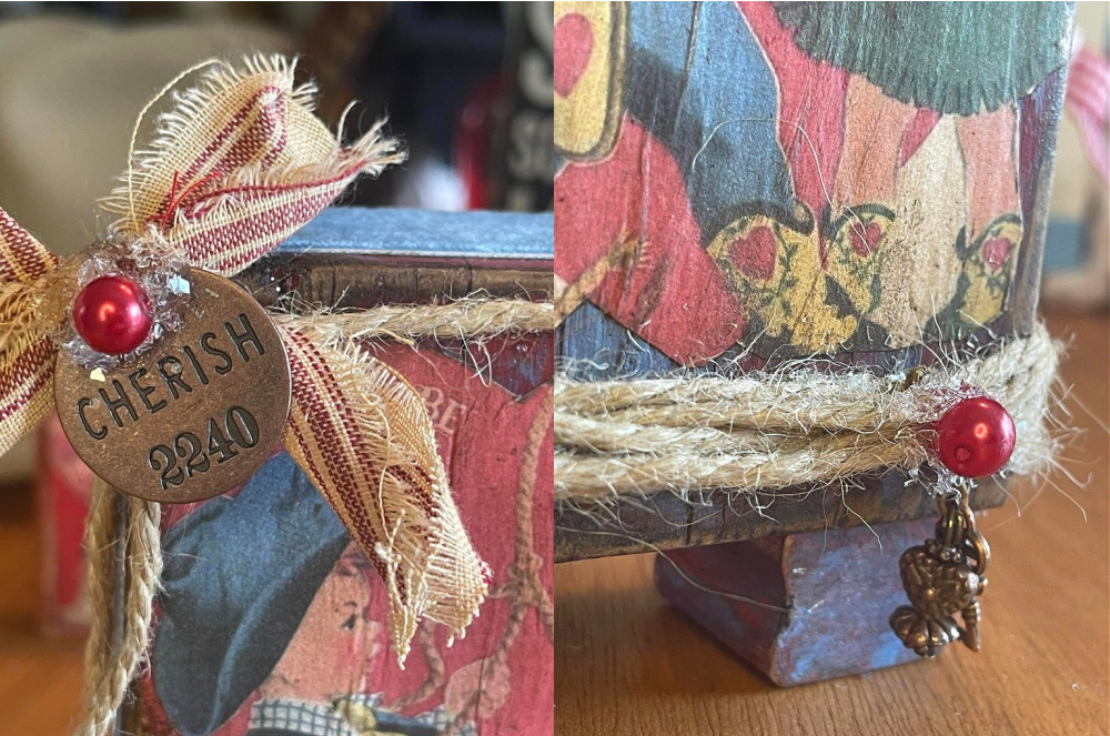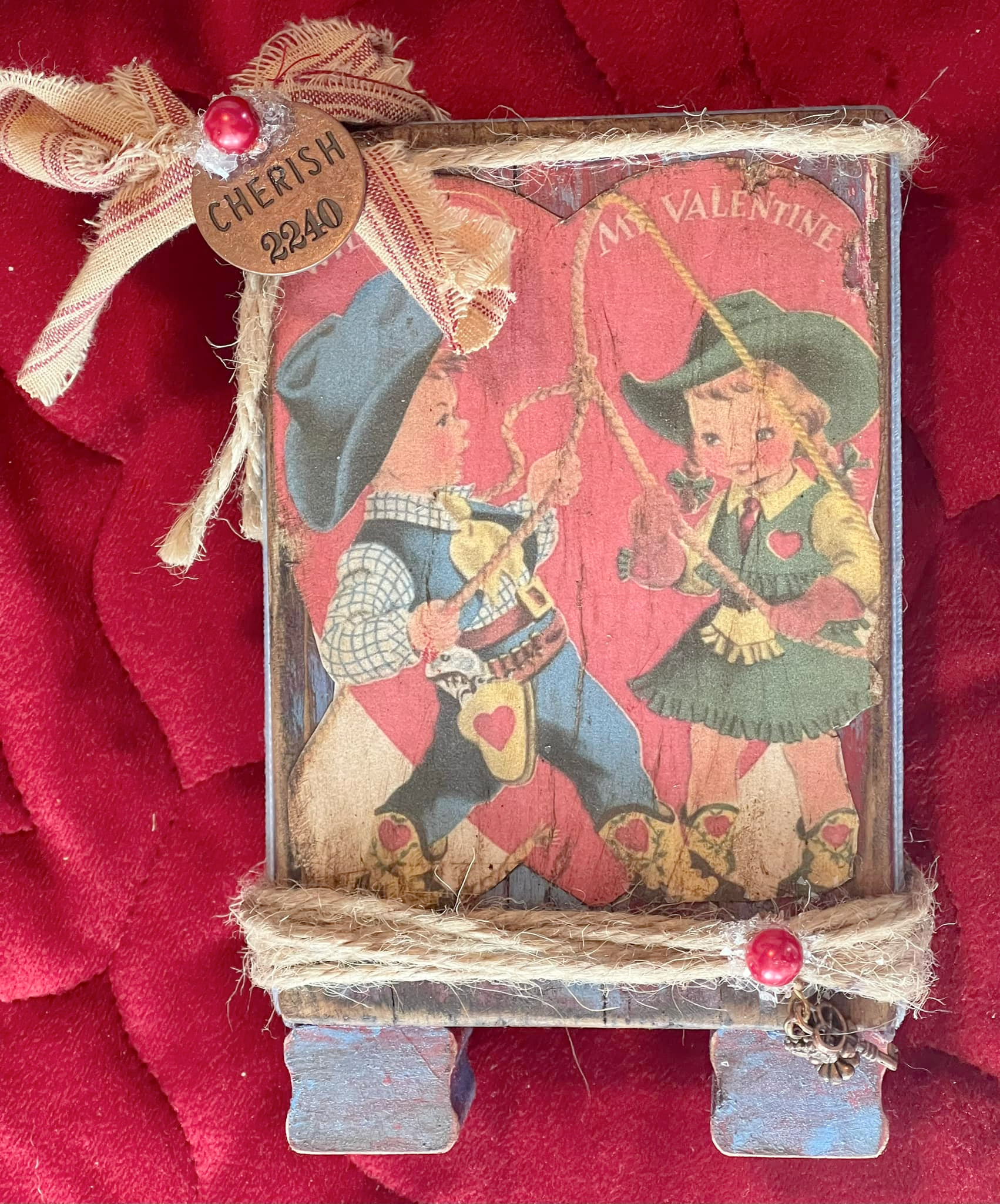 Absolutely darling decorated and painted wood block tiered tray or shelf sitter. Lots of attention to detail. The block and feet were painted 4 times, distressed and stained to get a true vintage vibe. The retro western Valentine's Day card print has also been distressed and stained. Dusty blue velvet trims the sides. Jute rope at the top and bottom adds more western style. The red striped tea-stained fabric bow is primitive, and a sewn-on copper round charm that says "Cherish" was added. A sugared red glass pearl sits on top. Below is another sugared red glass pearl, and two charms hang below: a copper heart and key. Just darling!
