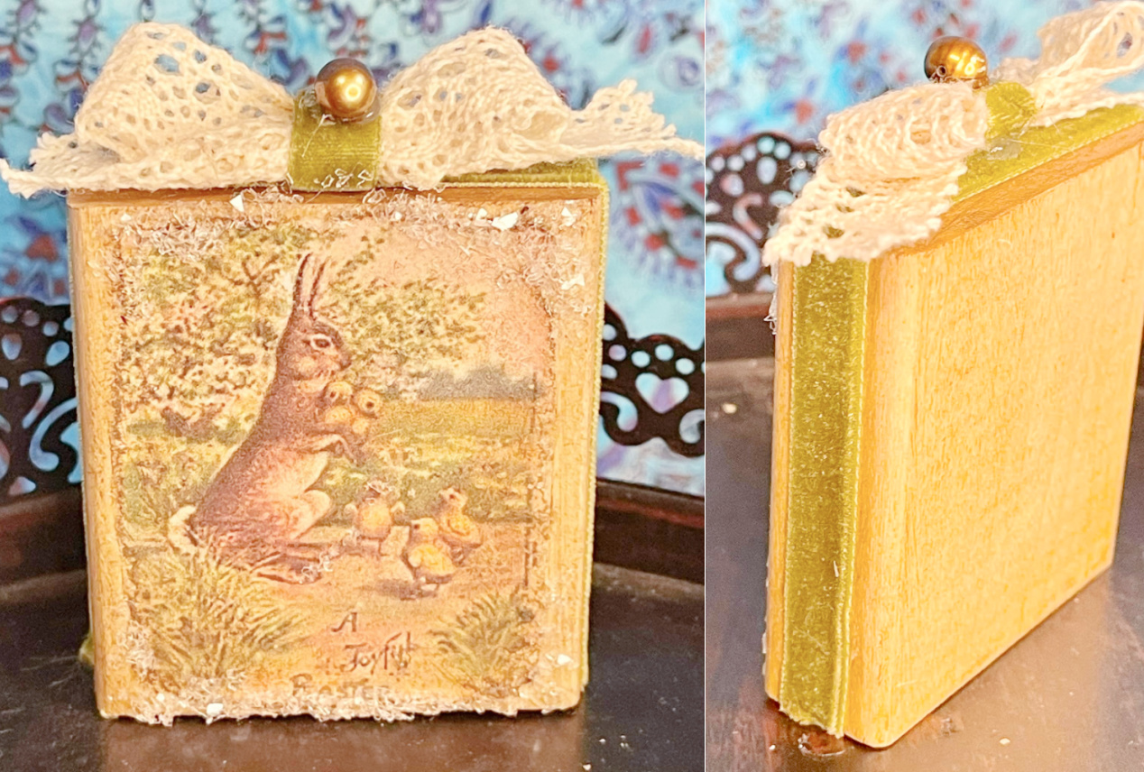 The small one has a bunny surrounded by little chicks in a country field. The print has been distressed, stained and sugared (like glitter). A soft green velvet ribbon wraps around the old wood stamp, and a crochet lace bow with pearl rests on top.