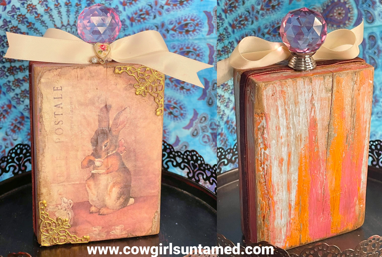 The large French Postale Carte bunny print has also been distressed, but in 3 colors: orange, pink and blue. Then sanded and waxed. Gold filigree sits in 2 corners. Brown velvet wraps the block, adding softness. A satin ribbon bow sits on top, with a vintage bauble in its center and a pink faceted crystal knob behind.