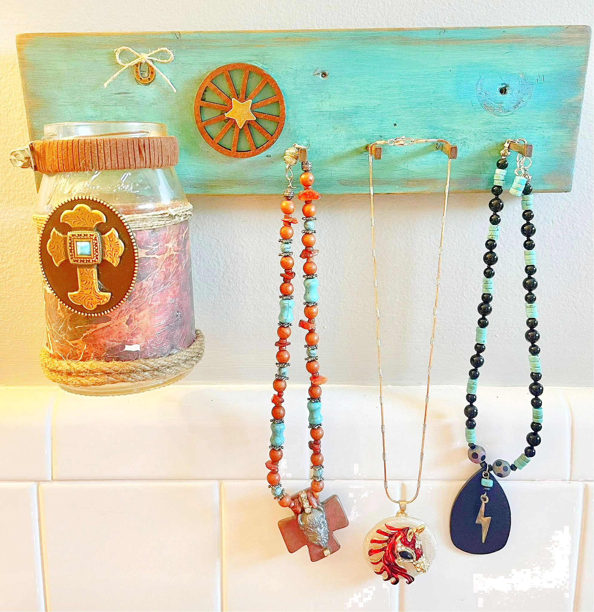 Handmade and one-of-a-kind Western Jewelry Organizer for your wall! 4 Horseshoe nails to hang necklaces, and a removeable upcycled glass jar to hold earrings and/or rings on a salvaged piece of painted and distressed wood.