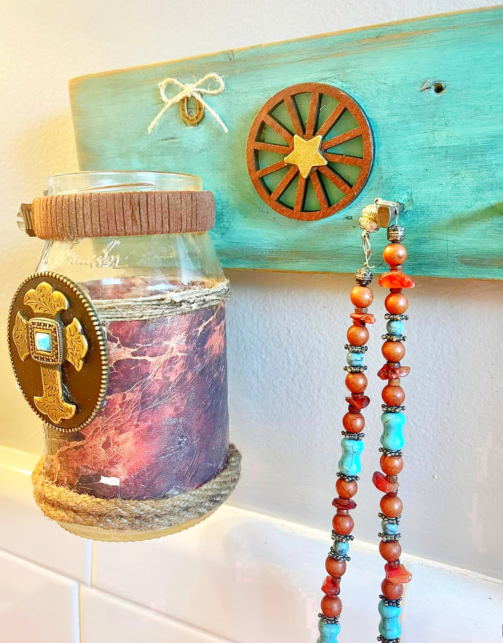 The wood has been painted in shades of turquoise, distressed and waxed. Clamp holding the upcycled jar has a brown leather wrap. The jar has been decoupaged in a cowhide print, jute rope and an upcycled brass cross with turquoise concho added that was on a belt. A wagon wheel with star and a lucky horseshoe with bow grace the front.