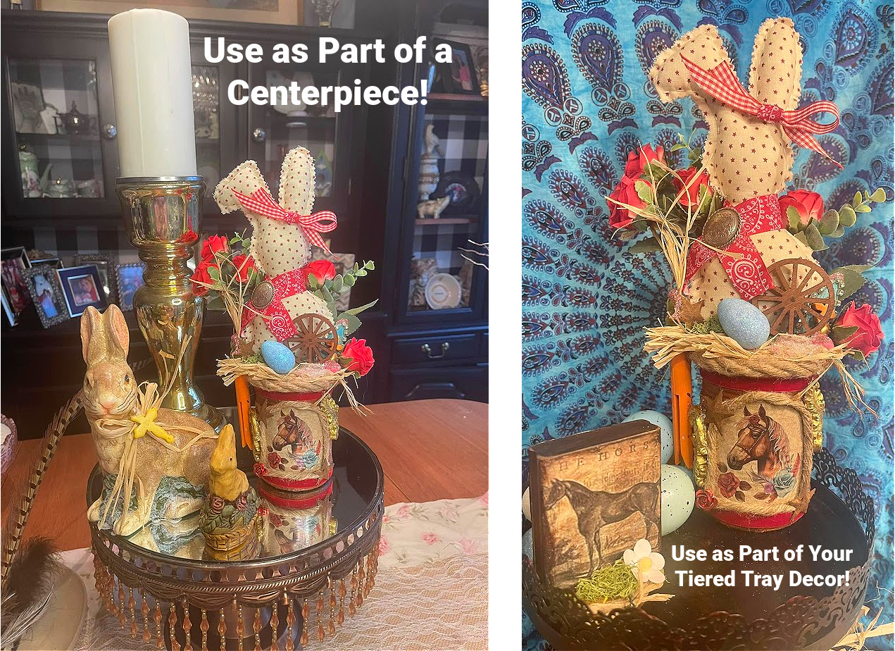 Handmade Vintage Horse Print Wild West & Velvet Ribbon on Faux Rusty Tin Can with Handmade Star Bunny Cowgirl Red Roses Easter Assemblage Western Decor
