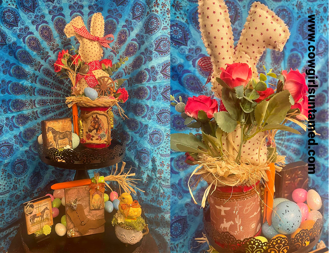 Our Star Bunny takes center stage amidst red silk roses, a wagon wheel, handmade wood clothespin carrot, turquoise with cross & rhinestone bit, handmade clay easter eggs and a big blue sparkling egg. All of which sits on a bed of raffia straw.