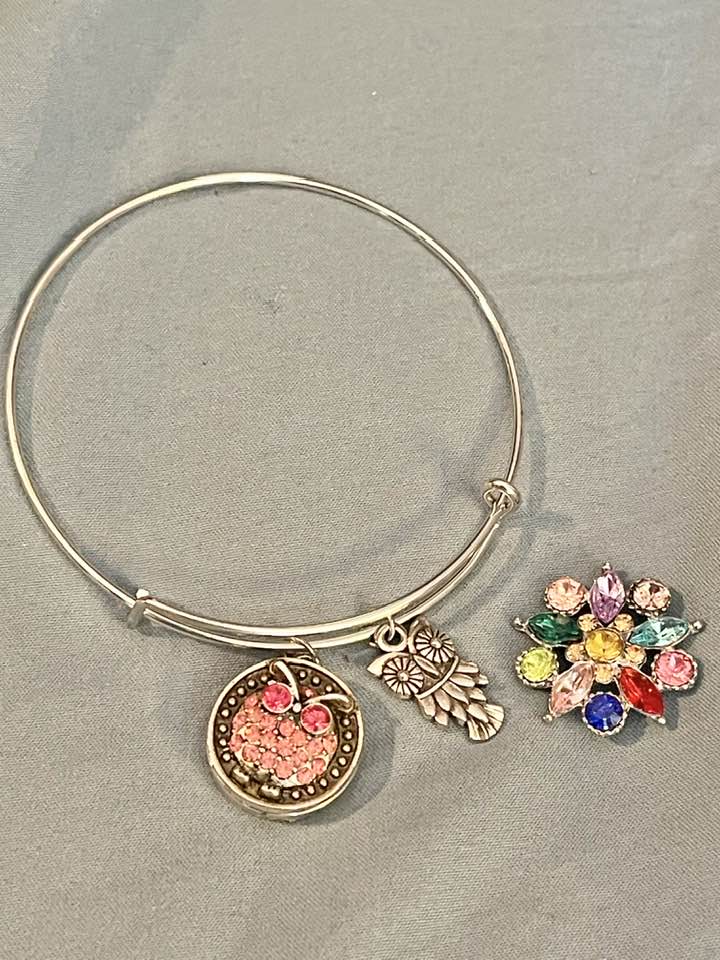 Silver & Pink Crystal Owl & Multi Color Crystal Flower Snap Charm Silver Bangle Bracelet - 2 Bracelets in 1