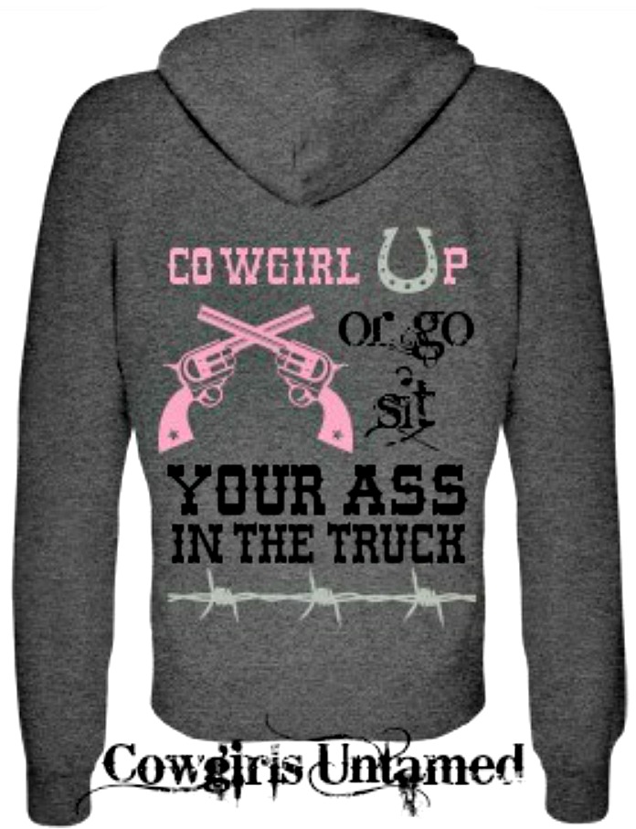 "Cowgirl Up or Go Sit Your Ass In The Truck" with Sixshooter Pistol N Silver Horseshoe & Barbed Wire Image Zip Up Western Hoodie Sweatshirt