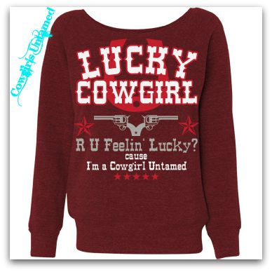"Lucky Cowgirl R U Feelin' Lucky? Cause I'm a Cowgirl Untamed" with Horseshoe Stars N Pistol Images on Off the Shoulder Long Sleeve Western Pullover Sweatshirt